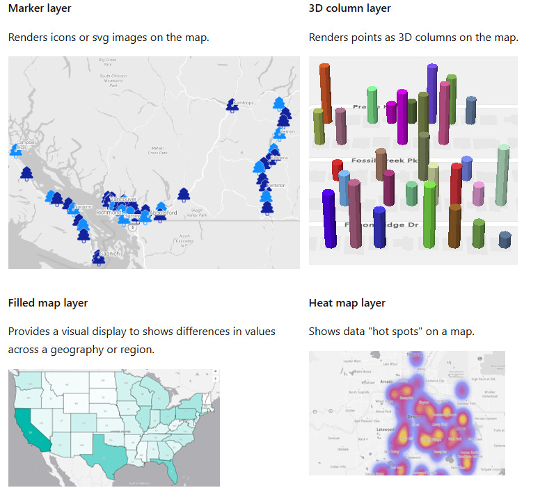 Azure Maps organizes map visuals using multiple layers — each designed for a specific kind of visualization.